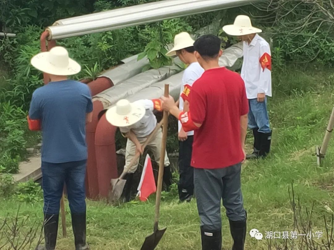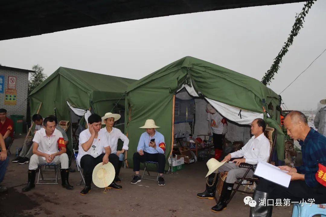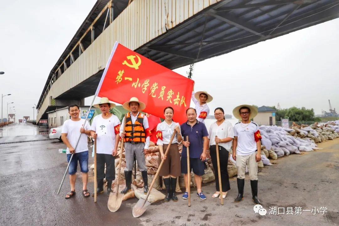 月26日,湖口县第一小学党员突击队一行在支部书记、校长黄晓萍,副书记柳海军的带领下,来到天灯堤,支援退役军人事务局,参与巡堤查险工作。